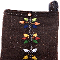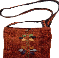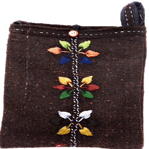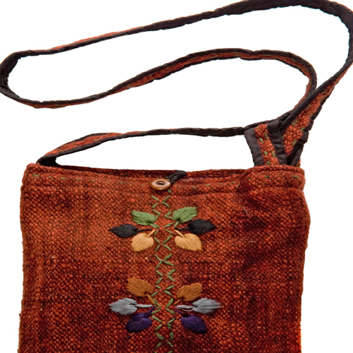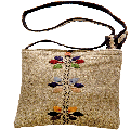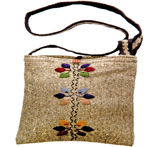 All natural, hand craft purse is 100% wool and is fully lined with 100% cotton. Embroidered with three flowers adorn the bag, button closure with inner zippered partition. The shoulder strap can be adjusted.